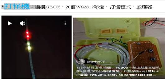 應用GBOX 工具箱---設計 TB1 打怪機 可做 4 種 Arduino基本專題製作。WS2812 彩燈模組,可以設計出小蜜蜂 1D 打怪程式,可以做遙控彩燈、聲控彩燈實驗、方便測試、專題製作、測試程式碼 定價 500 元 精簡筆記+C程式碼 ------ +購 20燈模組 +購GBOX ~LINE 洽詢
