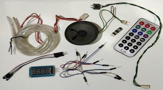自己準備好零件就可實驗:UNO、杜邦線 必備TM1637 顯示器、遙控器、接收模組、喇叭、WS2812