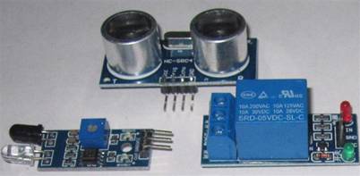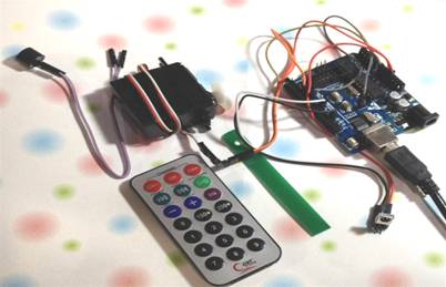 □系統組成:Arduino UNO相容板一片(已載入測試程式) +紅外線遙控器+接收模組+180度轉動伺服機+伺服機推桿+壓電喇叭+超音波模組+接近感應器+繼電器模組+USB下載線